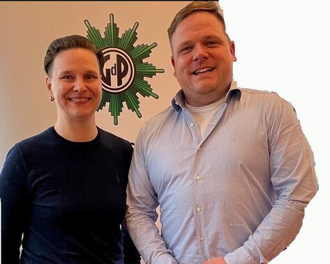 Die Vorsitzende der Direktionsgruppe Präsidium Natalie Jacob und der stellvertretende Vorsitzende Robert Engel sind für euch immer vorne mit dabei.